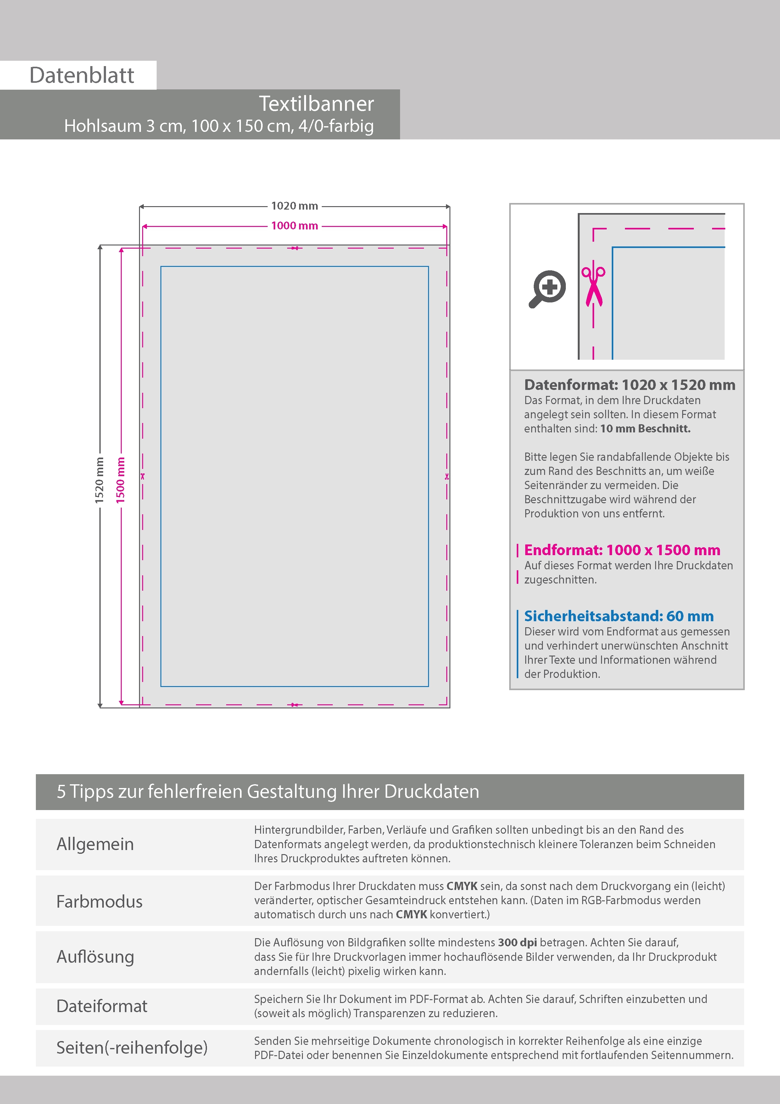 Hochwertige Stoff-Banner 100 x 150 cm, 4/0-farbig bedruckt, Hohlsaum links und rechts (Durchmesser Hohlsaum 3,0 cm)
