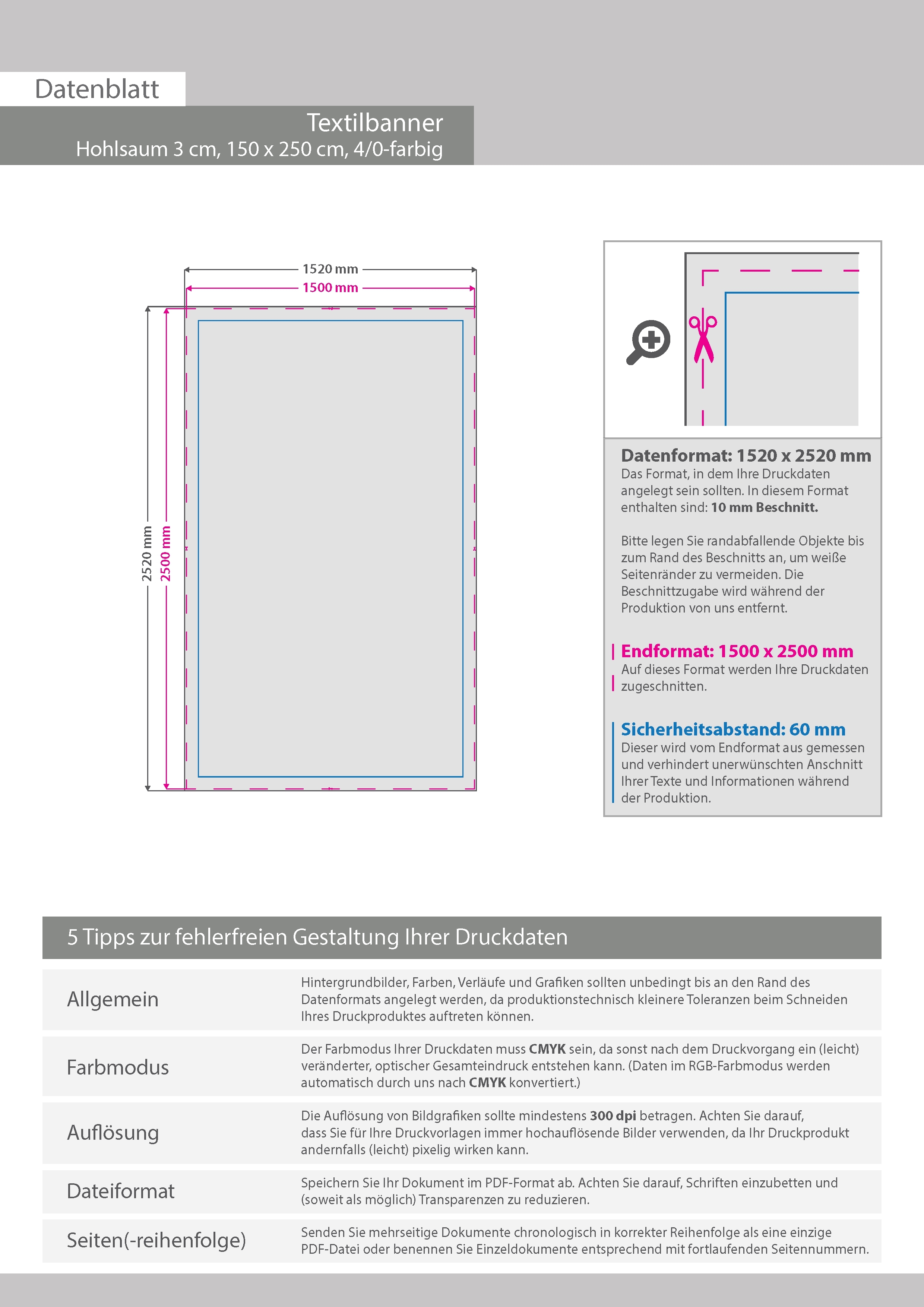 Hochwertige Stoff-Banner 150 x 250 cm, 4/0-farbig bedruckt, Hohlsaum links und rechts (Durchmesser Hohlsaum 3,0 cm)
