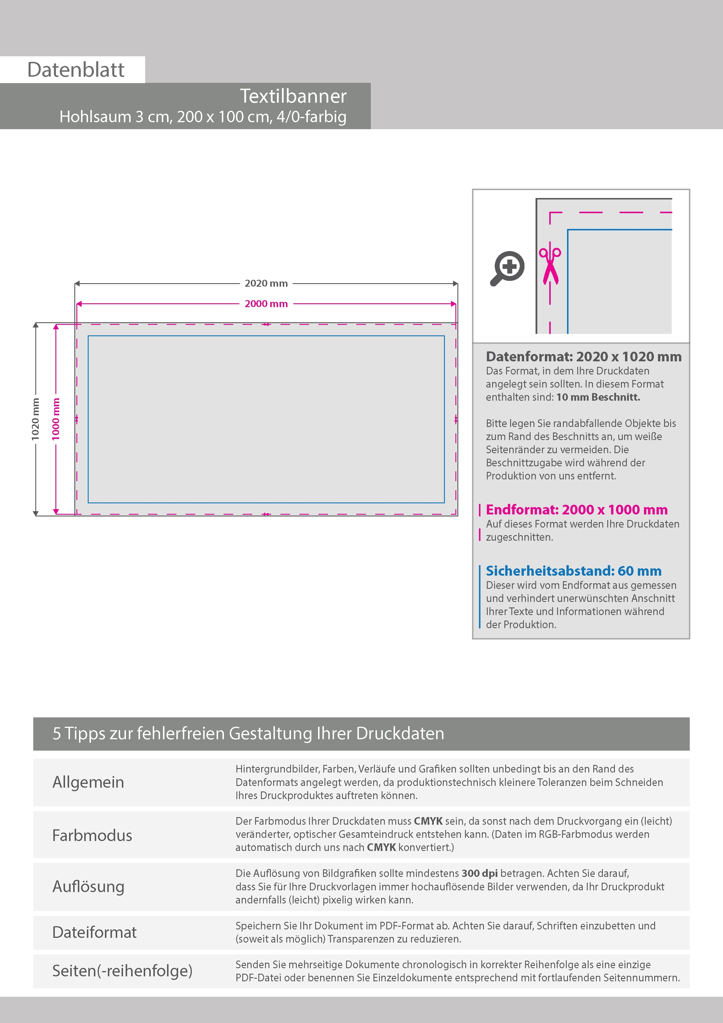 Hochwertige Stoff-Banner 200 x 100 cm, 4/0-farbig bedruckt, Hohlsaum links und rechts (Durchmesser Hohlsaum 3,0 cm)