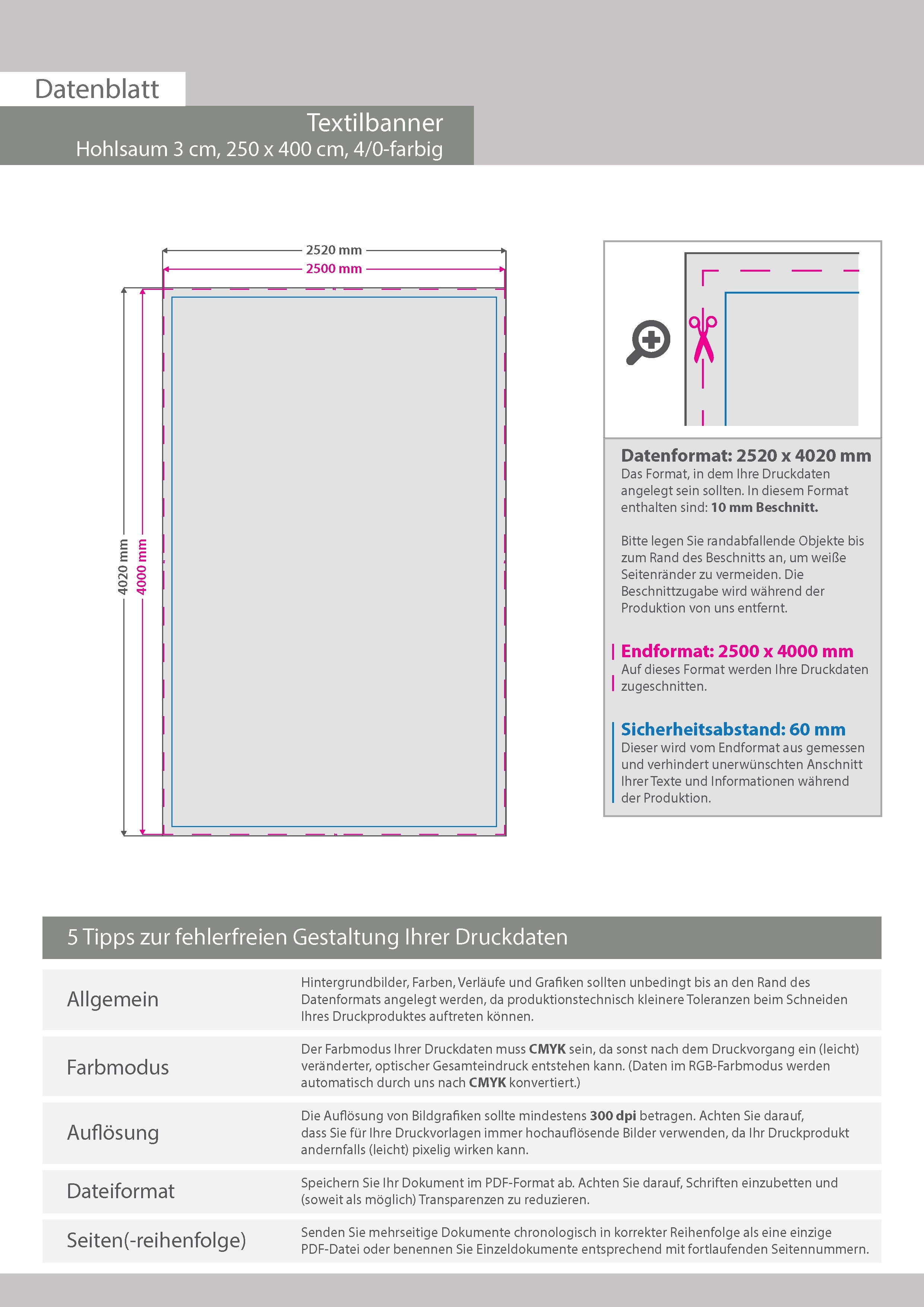 Hochwertige Stoff-Banner 250 x 400 cm, 4/0-farbig bedruckt, Hohlsaum links und rechts (Durchmesser Hohlsaum 3,0 cm)