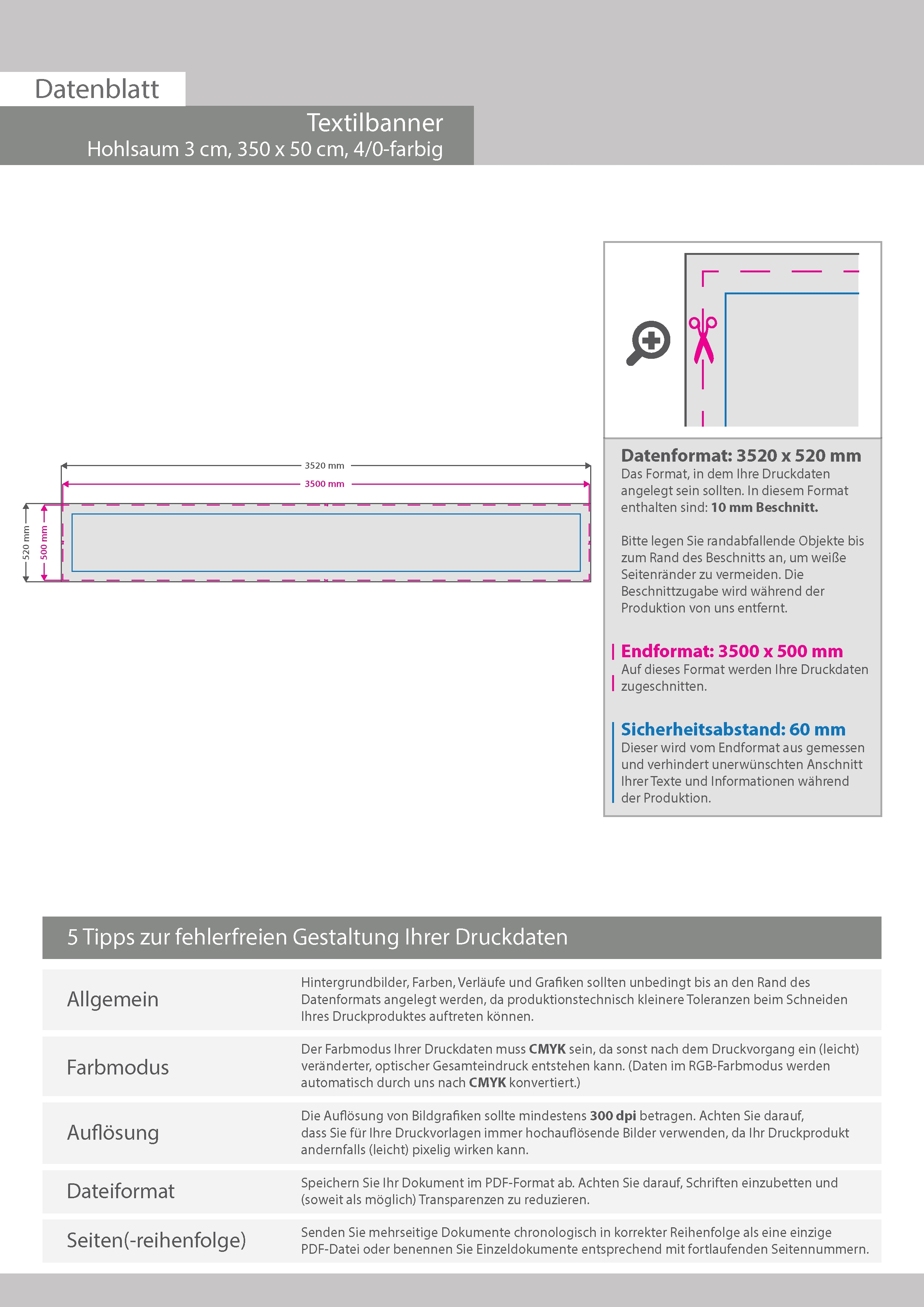 Hochwertige Stoff-Banner 350 x 50 cm, 4/0-farbig bedruckt, Hohlsaum links und rechts (Durchmesser Hohlsaum 3,0 cm)