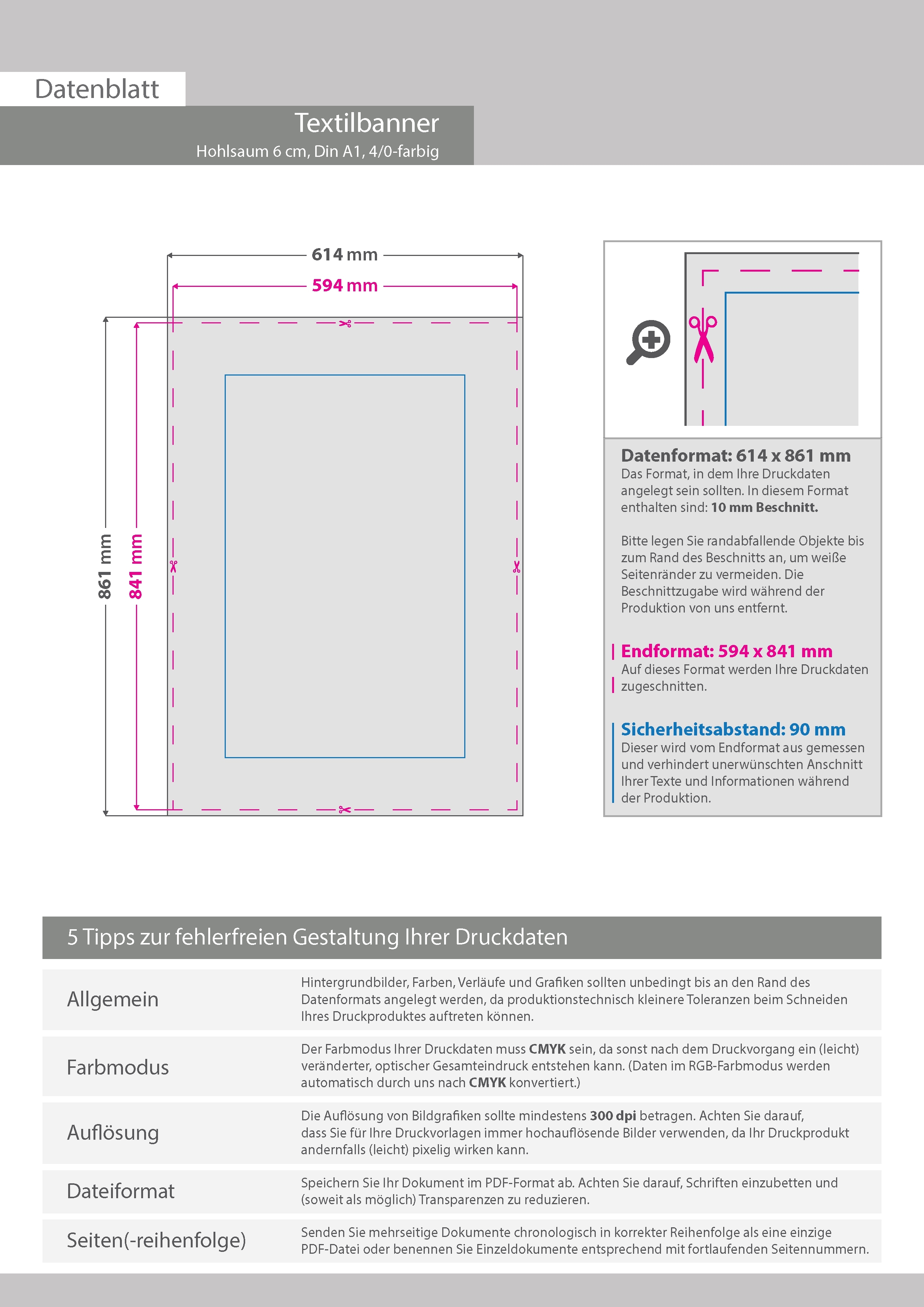 Hochwertige Stoff-Banner DIN A1 (59,4 x 84,1 cm), 4/0-farbig bedruckt, Hohlsaum links und rechts (Durchmesser Hohlsaum 6,0 cm)