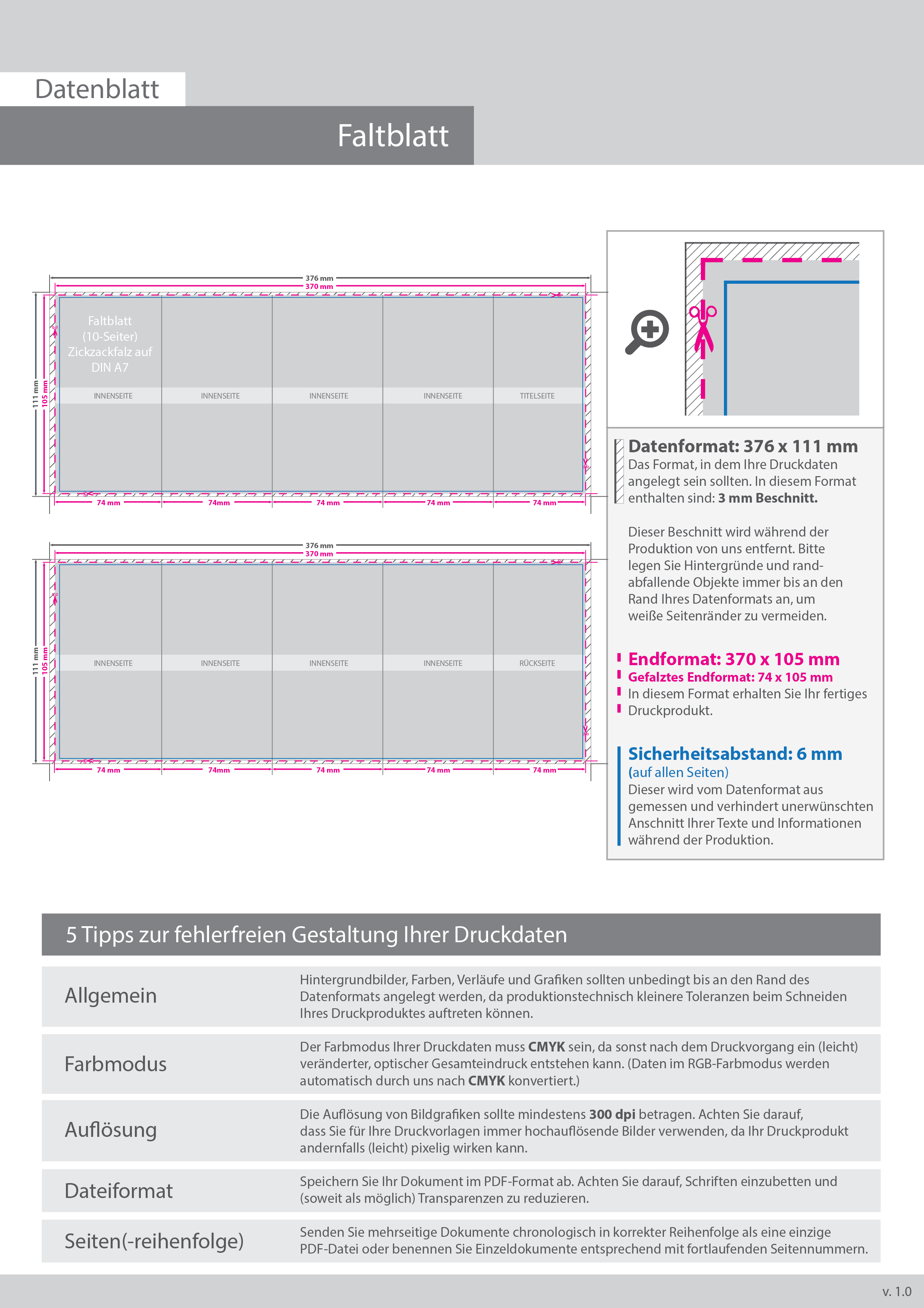 Faltblatt, gefalzt auf DIN A7, vertikaler Zickzackfalz, 10-seitig