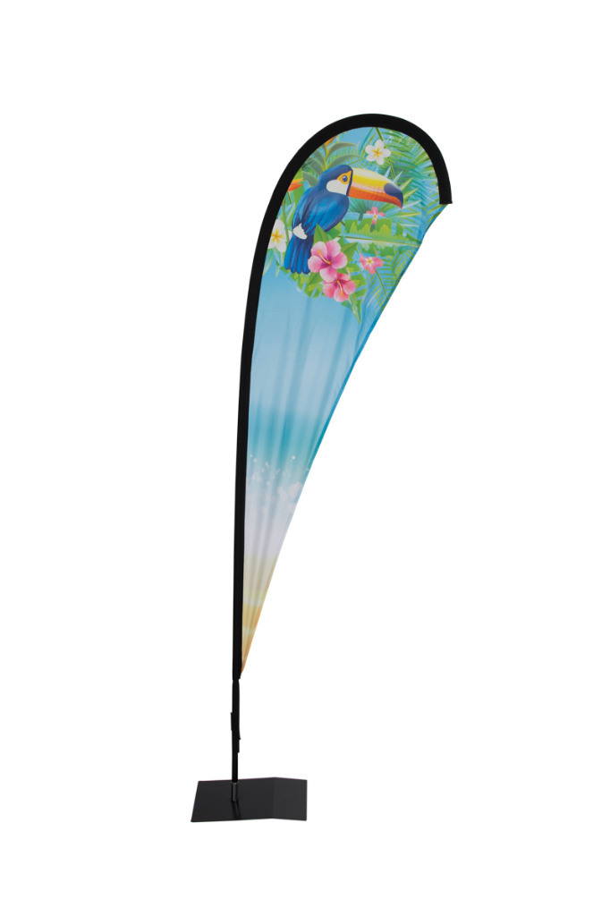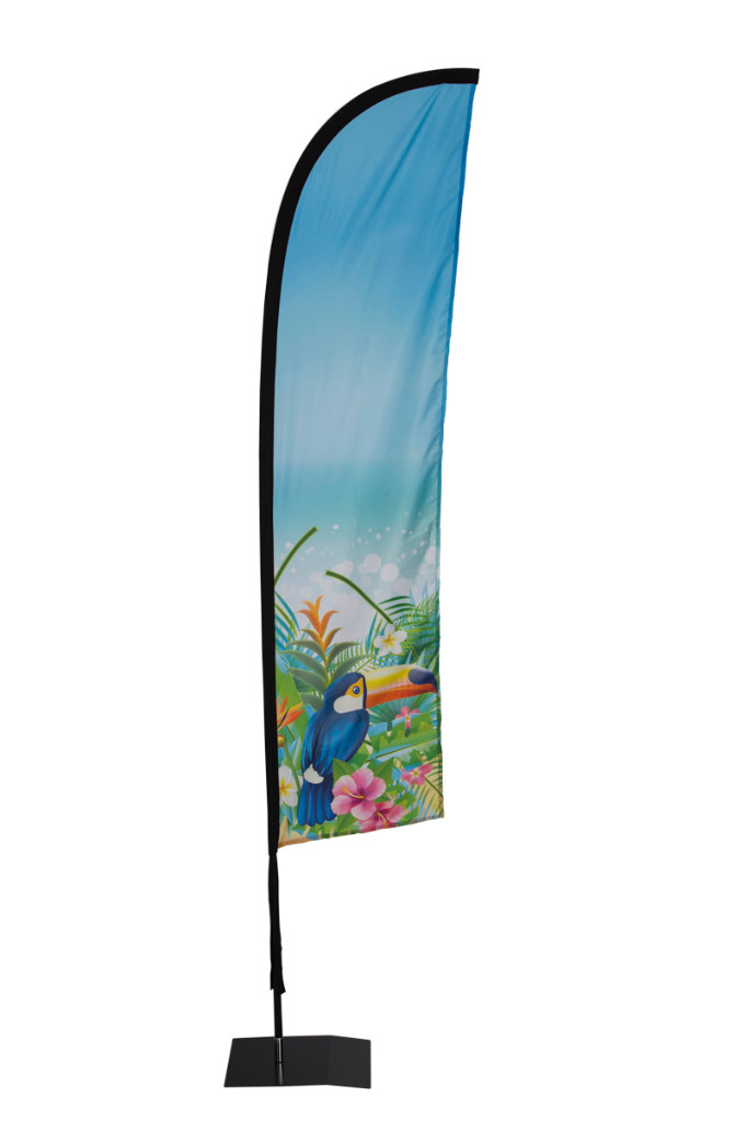 Beachflags machen stets eine gute Figur: indoor wie outdoor! Wir liefern unsere Beachflags inkl. stabilem Gestänge, einer praktischen Tasche sowie einer pulverbeschichtete Bodenplatte in schwarz (21cm x 30cm, 0,65kg) aus. Die Aufbauzeit beträgt rund drei Minuten. Bedruckt werden Ihre Beachflags einseitig vollfarbig auf 65g/qm Lightweight (B1 zertifiziert). Die bedruckbaren Stoffmaße unserer Dropflags betragen: 49cm x 145cm. Straightflags werden von uns in den Stoffmaßen 41cm x 158cm bedruckt. Die Gesamthöhe unserer Dropflag beträgt: 180cm, die Gesamthöhe der Straightflag 190cm.